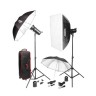 Комплект собранный на базе двух моноблоков предназначен для использования в небольших и средних студиях. Он включает в себя: два импульсных моноблока SK300II, две стойки Godox 304 с амортизатором, софтбокс SB-BW6090, фотозонт UB-002 (101 см, серебристый), фотозонт UB-004 (101 см, белый), пульт-радиосинхронизатор Godox XT-16, рефлектор Godox RFT 7 и сумка Godox CB-04.